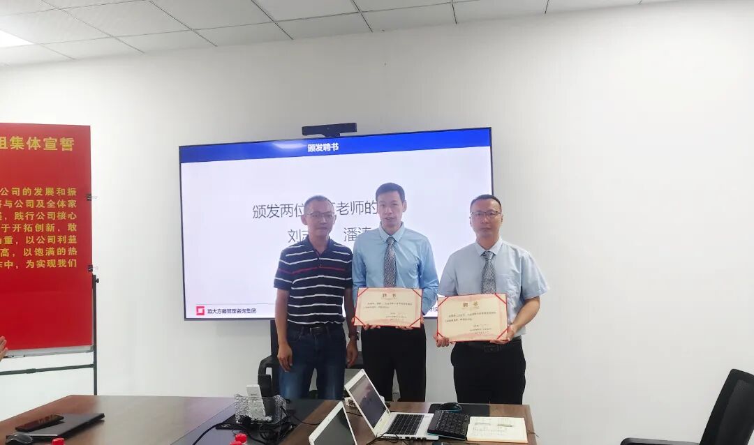 為促進項目的有效落地,明確各崗位職責,強化責任意識,會上陳總為遠大方略項目組頒發授權書,為項目組老師頒發了聘書。